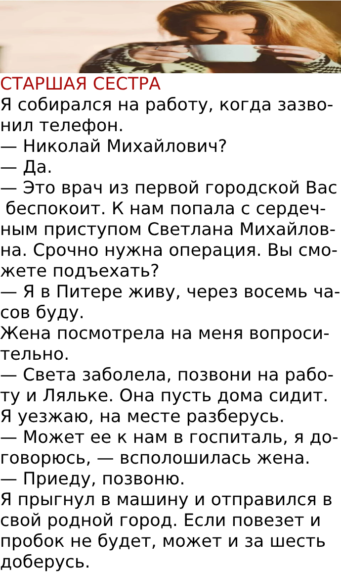 — Конечно, я сделаю. Не зря же ты мне пирожки посылала в военно-медицинскую академию. Вот и отработаю их. Не бойся, операция плевая.