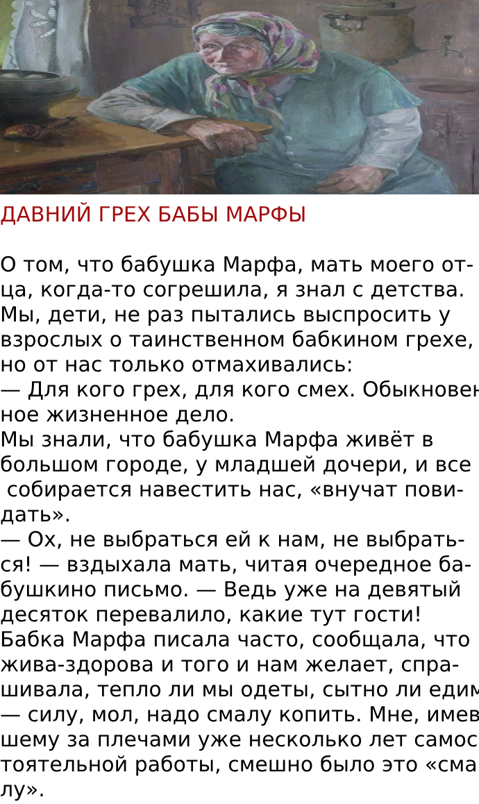Я представил полную, мощную тетю Нюру и рассмеялся: уж на грех она никак не была похожа.