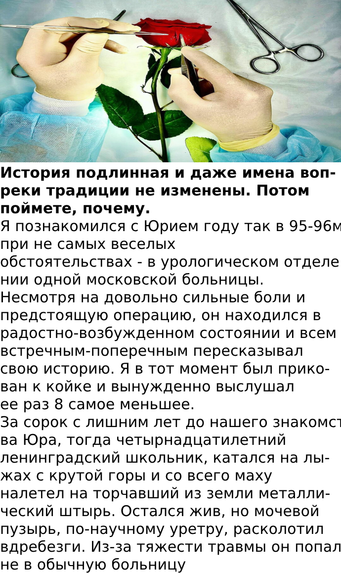 вынесли вердикт: остаток лет Юре предстояло доживать в виде резинового ежика, с дырочкой в правом боку, выведенной в нее трубкой и резиновым мешком-мочесборником. Можно представить, что это означало для 14-летнего пацана. Полное крушение надежд и планов, хуже смерти.
