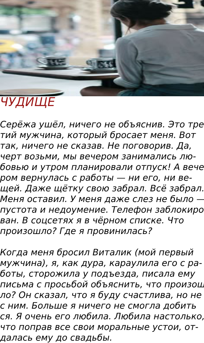 Я сирота, воспитанник детского дома. Вопреки разным слухам детдомовские девушки не все гулящие. Многие, наоборот, долго не решаются вступить в отношения. Я из таких. Мы год наслаждались счастьем, копили на свадьбу и на шикарный медовый месяц. Благо жить нам было где (однокомнатную квартиру я получила от государства). Пока однажды я не осталась одна в квартире. Виталик словно испарился. Не вынеся моих преследований он, в конце концов, уехал из города.
