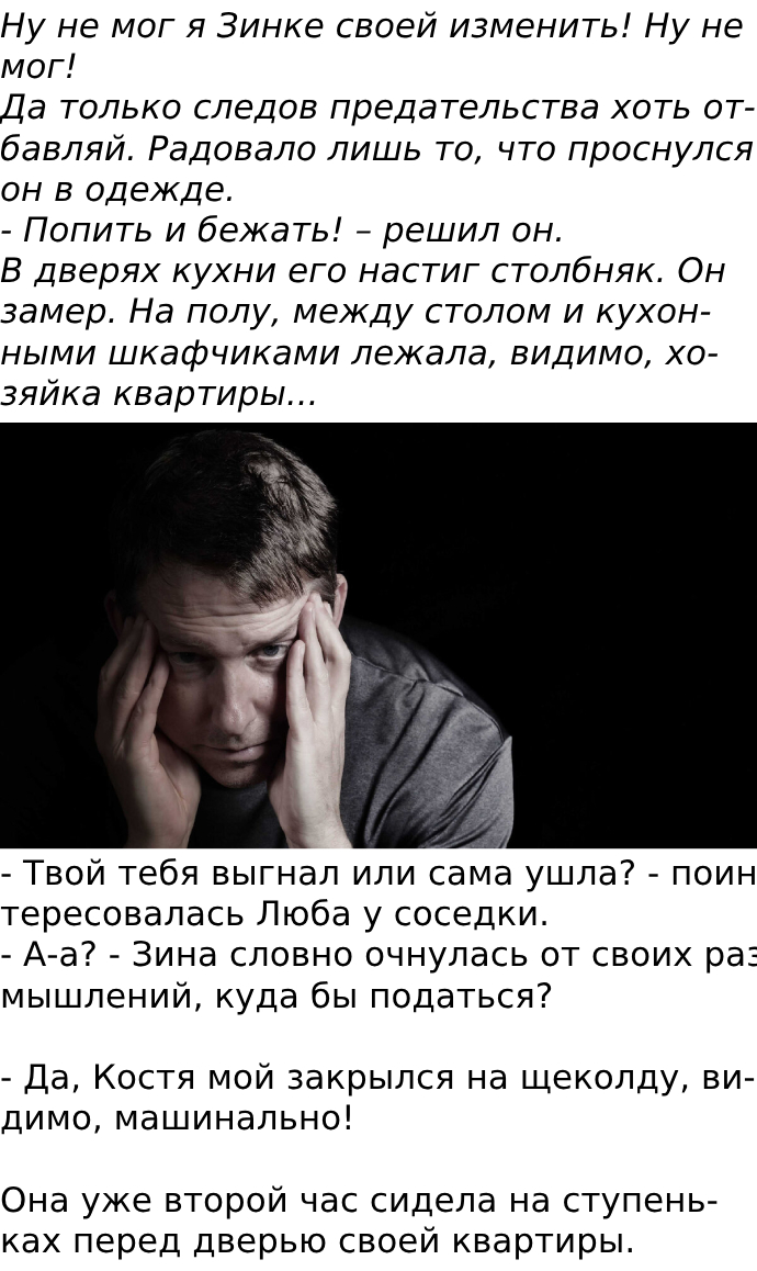 — Зиночка, я так виноват, что…, — он начал рыдать прямо сидя на полу в коридоре.