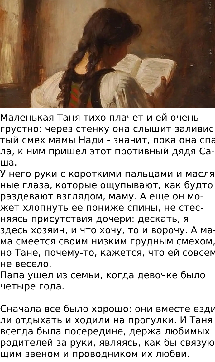 В один из вечеров они были втроем дома. Мама, как обычно, шебуршала на кухне. Танька, сидя, в кресле, читала книгу по внеклассному чтению. Тут мужчина неожиданно подошел близко-близко, и тяжело дыша в лицо какой-то дрянью, непривычно ласково спросил: