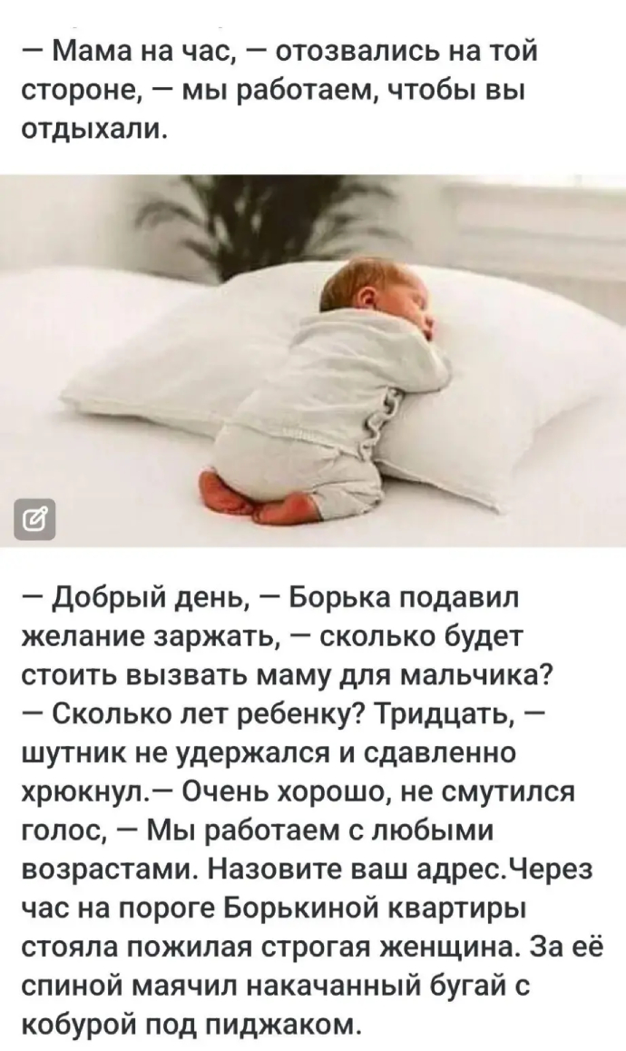 — Мама на час, — женщина посмотрела на Борьку поверх очков, — вот договор на оказание услуг. Подпишите.