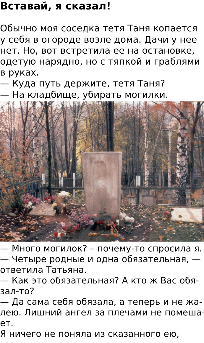 «И куда она подевалась-то окаянная? Вроде на комод ее клала, а теперь ее нет», — ругала я себя. Домой идти не хотелось, хоть устала сильно. Искать документы было просто тошно. Я оглянулась вокруг и тут заприметила одно надгробие, столь заброшенное и ветхое, что мне стало жаль покойного. Кто там похоронен, я не могла узнать. Надпись была стерта, и на месте отчества были две буквы «ич» — стало быть, покойник мужчина: «Анатольевич, Сергеевич, Степанович? Бог его знает. Кое-как разобрала дату смерти «1971-й год». Засучив рукава снова, я принялась вырубать разросшийся кленовник и вишняк, убирать амброзию и портулак. Надобно было бы еще оградку покрасить, да кто ж этим заниматься будет. Где родня загадочного «ича» — поди, дознайся.