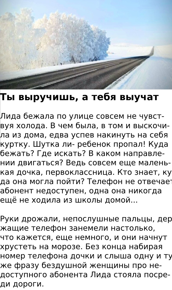 Без конца перезваниваясь со свекровью, Лида шла и шла, размазывая слезы по лицу. Правильно бабушка всегда говорила, мол ты выручишь, а тебя выучат. Так и получилось. Сколько раз за эти почти пол года выручала Лида Иру, увозя и забирая Никиту из школы, можно даже сказать, что в обязанность ей это уже вошло, и ждала его у школы, несмотря на то, что и сама на работу опаздывала, и Димка опаздывал, а стоило ей один раз попросить, вот выручила, так выручила. Выучила, а не выручила. Надолго теперь запомнится эта наука. Только бы доченька нашлась! Столько всего нехорошего сейчас творится, что и думать страшно…И что, что городок маленький, мало ли людей разных? Да еще зима, мороз с ветром. Январь, как никак.