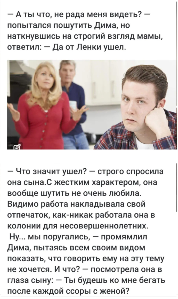 — И что? — посмотрела она в глаза сыну: — Ты будешь ко мне бегать после каждой ссоры с женой?
