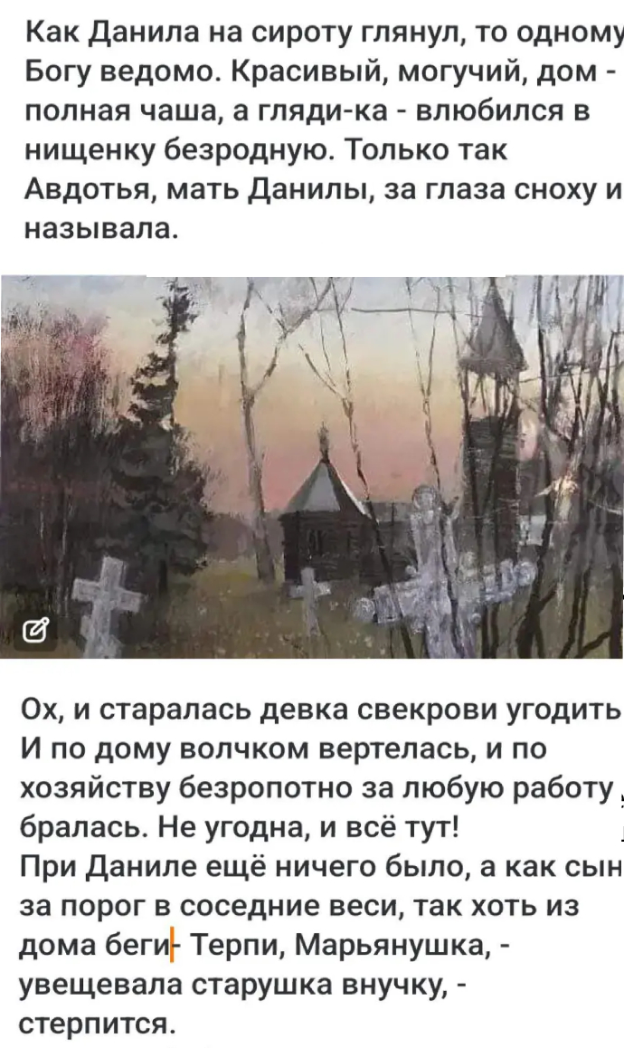 Как Данила на сироту глянул, то одному Богу ведомо. Красивый, могучий, дом — полная чаша, а гляди-ка — влюбился в нищенку безродную. Только так Авдотья, мать Данилы, за глаза сноху и называла.