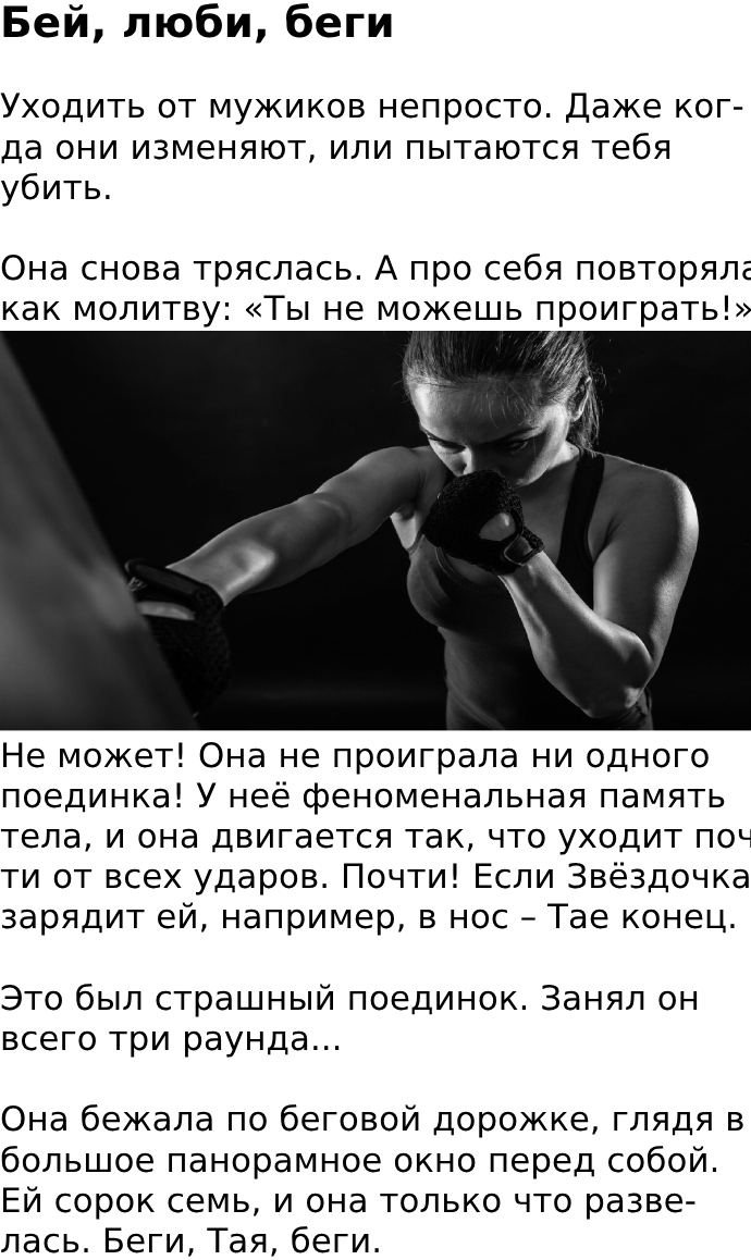 Сдавая ключ после ударной тренировки, Тая увидела рекламный буклет. Бои без правил. Она удивлённо посмотрела на девушку-администратора.