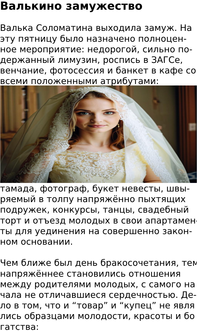 В конце концов пришли к соглашению, что платье себе купит невеста, кольца приобретут вскладчину, а всё остальное обеспечивает семья жениха. Бабушкину квартиру пришлось отремонтировать, на что ушли все немногочисленные накопления, поэтому платье взяли напрокат. Наскребли на свою половину за кольца, и решительно пресекали любые попытки раскрутить их на дальнейшие расходы: “Мы даём молодым квартиру, этого от нас достаточно с избытком!”