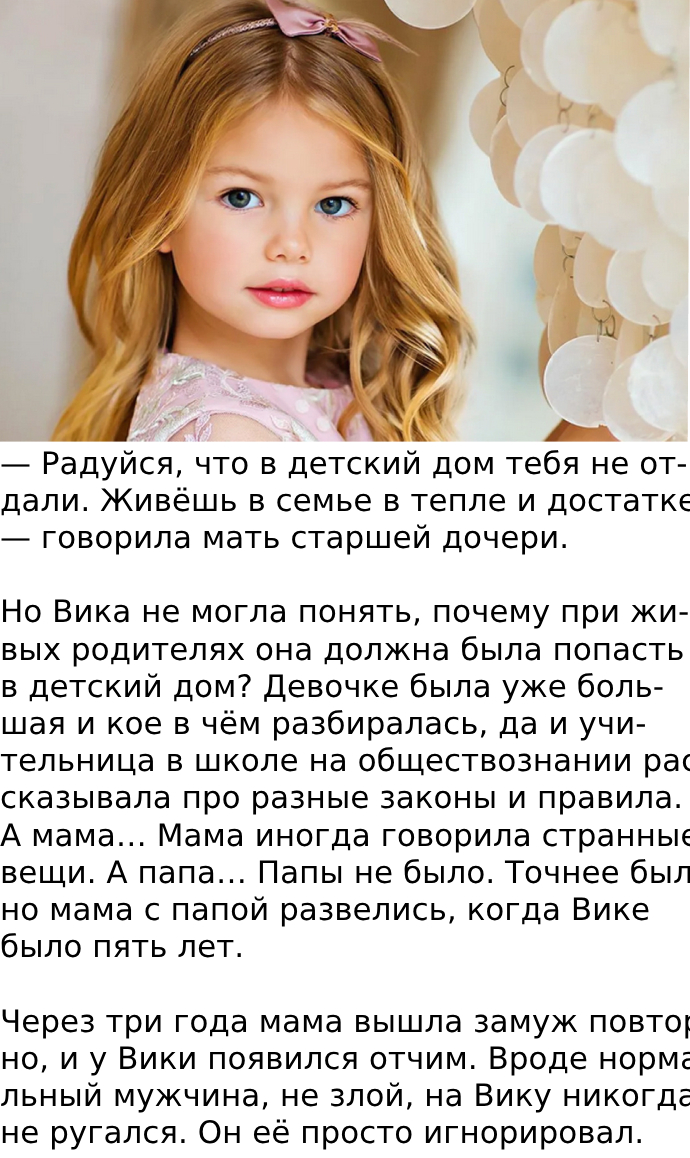 А уж когда через ещё три года у Вики появилась младшая сестра Арина, то девочка полностью убедилась в своих сомнениях. Арину родители боготворили. И к ней отчим относился совершенно по-другому.