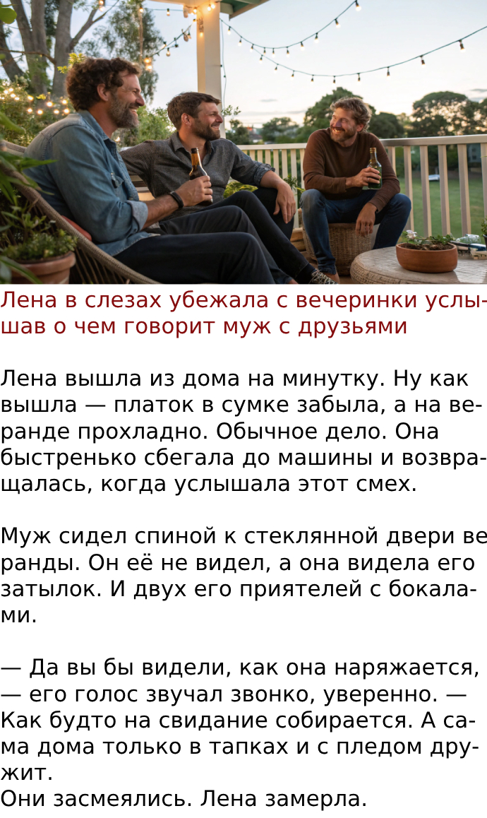 — Лена, я был пьян. Это всё не то, что я на самом деле думаю, — он потянулся к её руке. — Ты же знаешь меня.