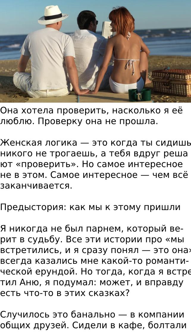 На тот момент я ещё не осознавал, что Аня из тех, кто больше доверяет тестам и проверкам, чем своему мужчине.