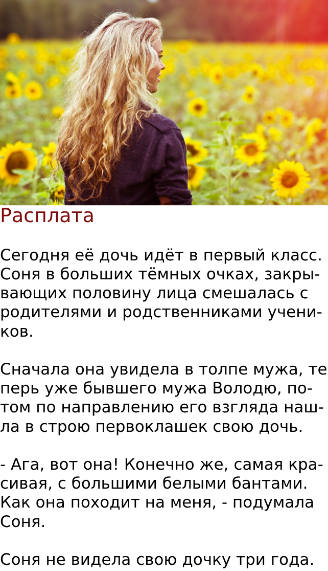 – Прости, но я ухожу от тебя. Я полюбила другого. Если ты мне дашь разрешение на выезд дочери за рубеж, я заберу её с собой сейчас, если нет – вернусь за ней позже, – объяснила своё отсутствие Соня.