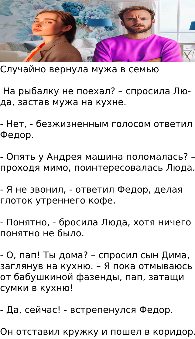 Тем удивительнее было для Люды обнаружить мужа дома, когда, как и она, он был в отпуске, и не поехал на рыбалку с Андреем на все выходные.