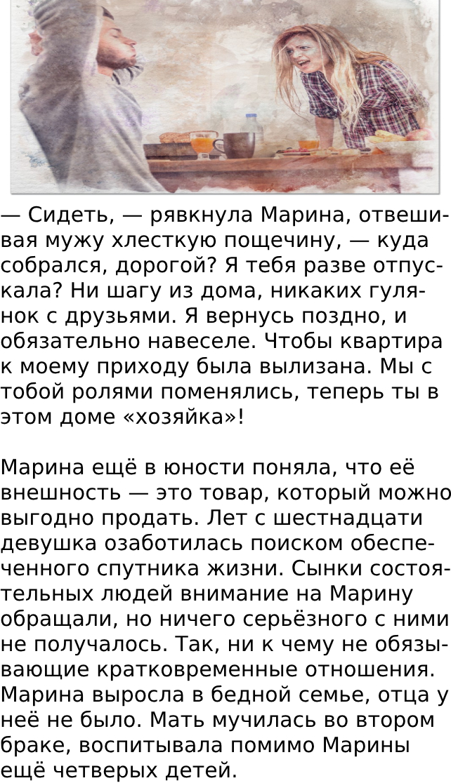 — Да, именно так, — кивнул Константин, — я, Марина, деньги зарабатываю не для того, чтобы ты их разбазаривала. Я придерживаюсь мнения, что жить нужно скромно. Во-первых, так безопаснее: если окружающие думают, что у тебя нет денег, то ни у кого и мысли не возникнет тебя ограбить. А во-вторых, у меня на будущее большие планы! Я планирую ещё пару-тройку лет поработать, а потом идти в бизнес. Знакомства нужные уже завязал, присматриваюсь к этой сфере. Средства мне понадобятся на развитие. Как жену я тебя всем обеспечил: ты одета, сыта, у тебя есть крыша над головой, а всё остальное — блажь.