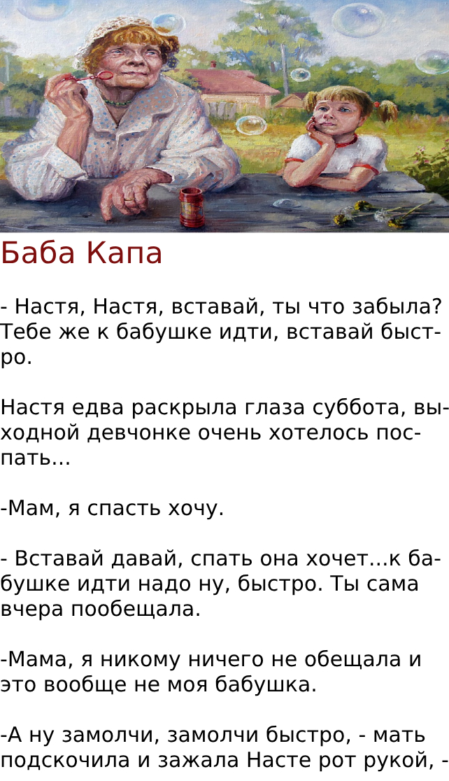 – Пижама, – тихо шепчет Настя, ей отчего-то нравится новая бабушка, баба Капа.