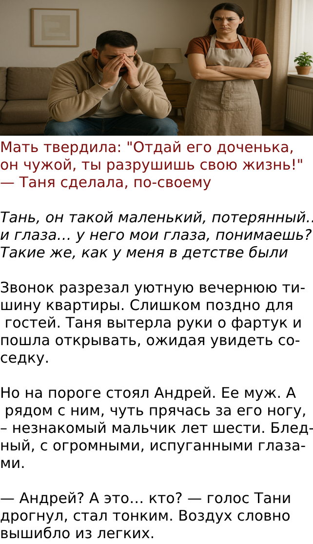 Таня осталась в гостиной с Андреем. Тишина в квартире стала оглушительной после ухода детей. Она посмотрела на мужа. Боль не ушла. Но теперь к ней примешивалась усталость и осознание – это уже не только их драма. Это теперь и жизнь этого молчаливого, испуганного мальчика.