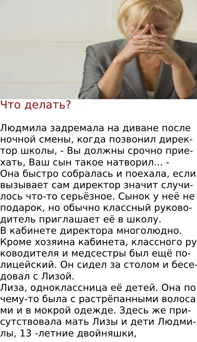 — Я не знаю, что делать? С Вашими детьми постоянно работает школьный психолог, результаты нулевые, — и директор вопросительно посмотрел на Людмилу.