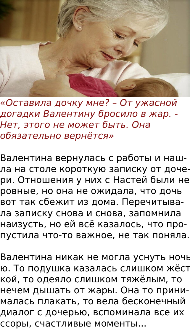 Но наткнулась на холодный взгляд Насти и остановилась у порога. Когда дочь вошла в прихожую, Валентина только тут заметила у неё на руках ребёнка.