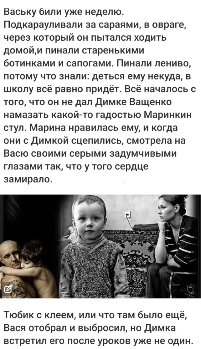 Ваську били уже неделю. Подкарауливали за сараями, в овраге, через который он пытался ходить домой, и пинали старенькими ботинками и сапогами. Пинали лениво, потому что знали: деться ему некуда, в школу всё равно придёт. Всё началось с того, что он не дал Димке Ващенко намазать какой-то гадостью Маринкин стул. Марина нравилась ему, и когда они с Димкой сцепились, смотрела на Васю своими серыми задумчивыми глазами так, что у того сердце замирало.