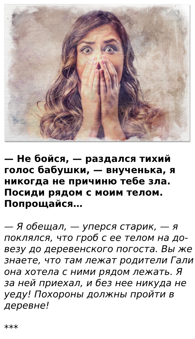 Невероятно, но страх тут отступил. Лену словно окатило волной тепла и спокойствия. Она открыла глаза и почувствовал, как дрожь уходит из тела. Лена перестала трястись в углу. Она осторожно придвинулась к гробу, придерживая его, чтобы его не мотало на ухабах. В голове начали всплывать светлые воспоминания о бабушке: как она пекла ее любимые пироги, как рассказывала сказки перед сном, как учила ее читать и писать.