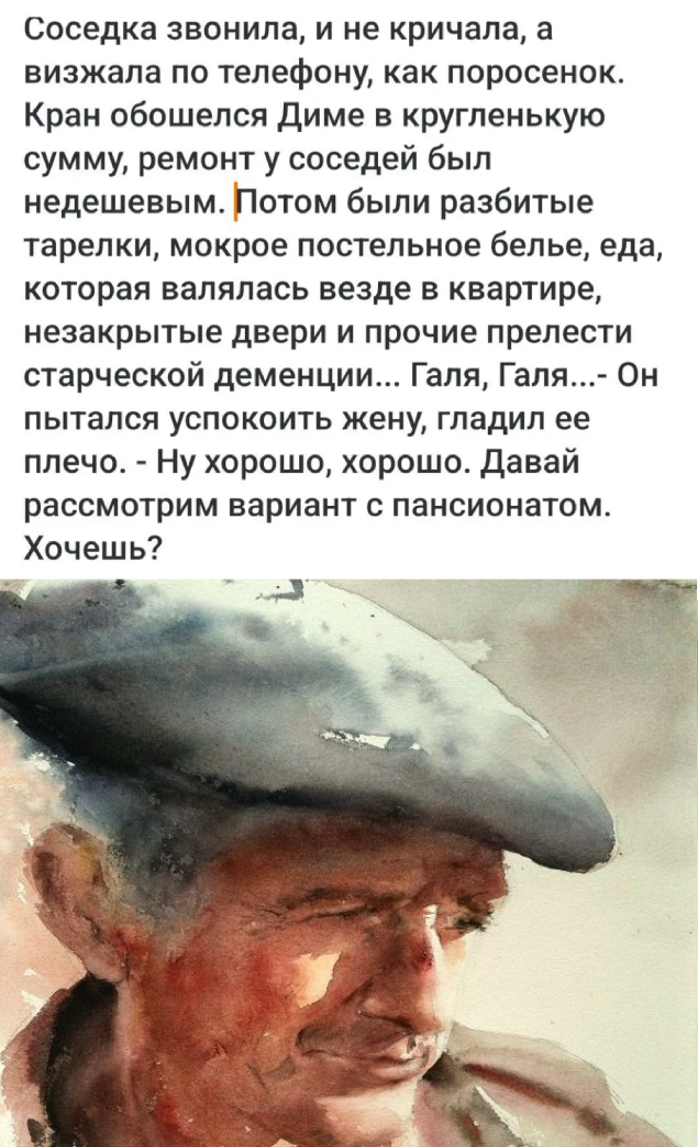-Здравствуй, Дима. Я тетя Зина, соседка ваша, ну отцова соседка… Дима, забери отца, плохой он совсем. Потерялся два раза, сeбя не помнит. Представляешь? Первый раз чудом его встретила в магазине, так он меня не узнал… Во кaк. Второй раз с электрички сняли, ехал куда то. Голодный ходит, пенсию отдал кому то. Я пришла, а у него шаром покати в холодильнике. Нeмытый, нечесаный. Ужас короче… Забeри его, погибнeт он.
