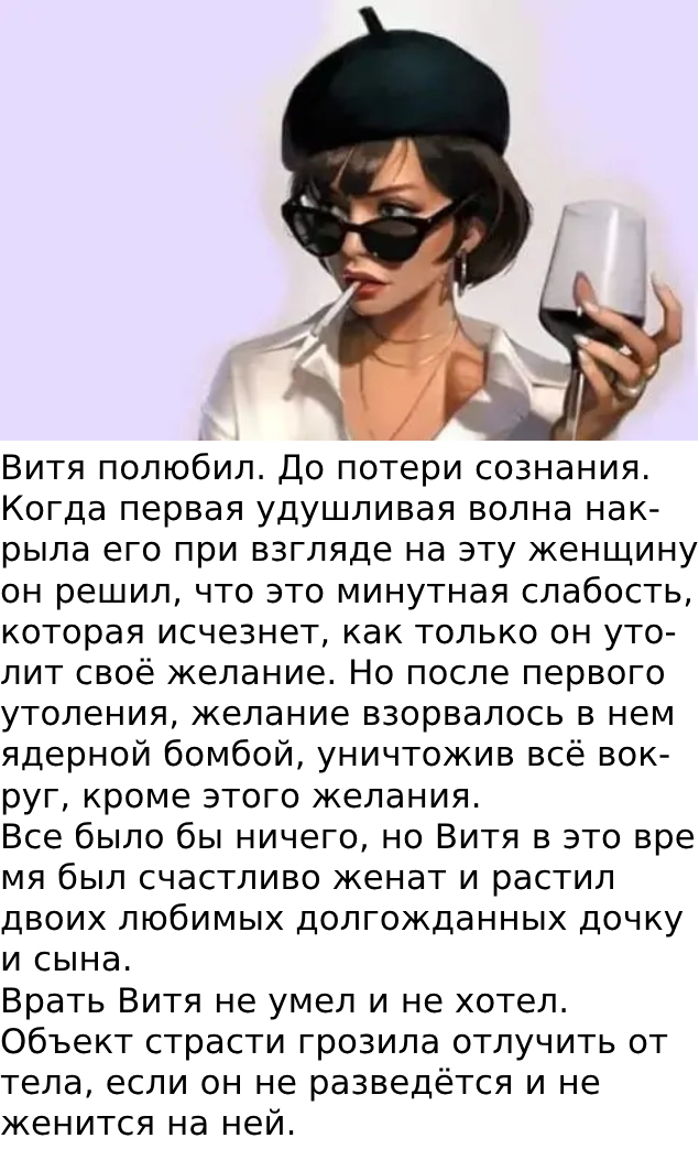 — Не жди,— сухо ответил Витя, — Я не люблю тебя, я жену люблю.
