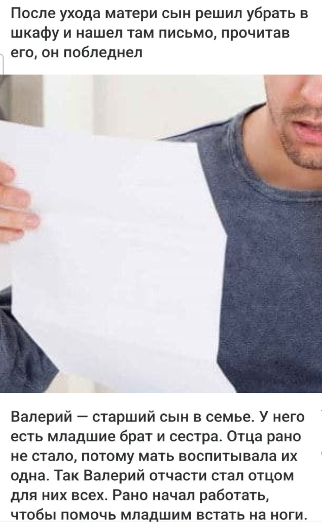 Также к письму прилагалось завещание. В нём было сказано, что накопленные деньги стоит разделить поровну между ее младшими детьми. Квартира же должна была перейти Валерию без права разделения имущества. Валерий был ошарашен таким количеством новостей в один день. Жена, которая как раз вошла в комнату, испугалась. Он был бледен.