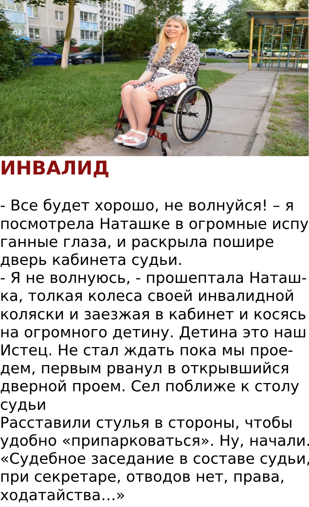 – Да, извините этот Истец, он все врет! Понимаете я в этом доме живу с детства. Мне квартира от родителей достались. Мы в аварию попали. Они погибли, а я вот, на кресле.