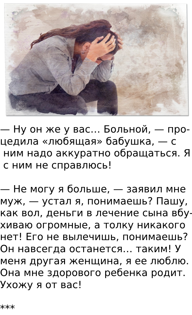 — О, нет! Не буду я его на руки брать, — сказала свекровь, когда я попросила ее передать мне сына, — сама давай. Еще сделаю что не так. Он же больной, с ним аккуратно нужно…