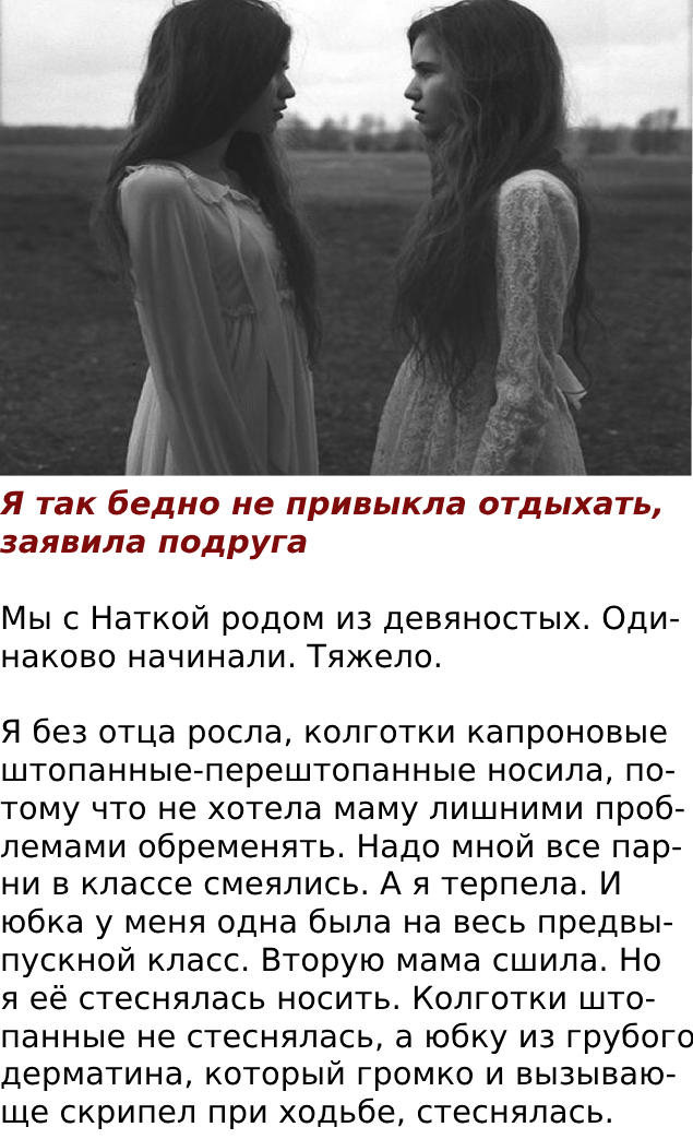 -На поезде? Серьёзно? – изумилась Натка. – Вы что ездили в плацкартном вагоне? Я только самолётами летаю. А если поездом, то только Сапсаном. Разве это отдых? Если уж вы отдыхаете в России- хотя как можно в России нормально отдохнуть, не понимаю – надо заказывать только лучшие отели. И в столовках есть? – Натка сморщилась. – Ну такое себе. Надо себя баловать, Оля! Я только в ресторанах питаюсь. Столовскую еду можно и дома поесть.