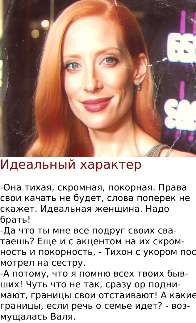 Тихон только рукой махнул. Он уже привык к тому, что старшая сестра мечтает устроить ему личную жизнь. Однако ему характер бывших девушек не мешал, расставания были по-другому поводу. Валя же считала, что именно гонор избранниц Тихона рушил все.