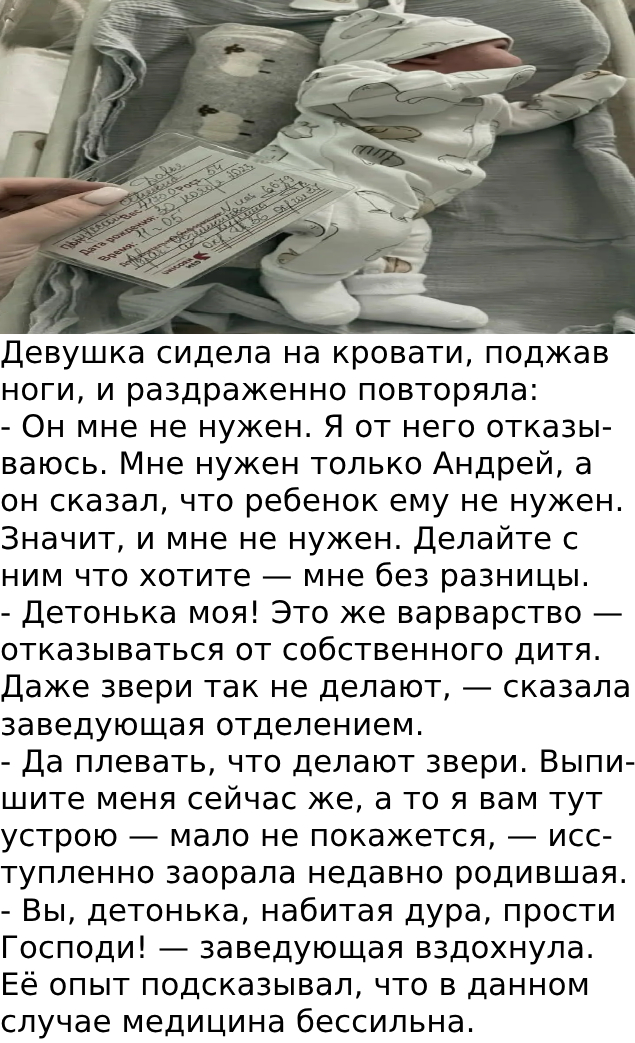 Но в один из дней этой идиллии пришел конец. Девица случайно узнала, её парень на ком-то женился. Она пришла в исступление и в ярости кричала, что все вокруг это специально подстроили, чтобы их разлучить. Она ненавидит всех, а больше всего ненавидит этого ребенка. Если бы его не было, она бы сейчас была с Андреем, и они были бы счастливы. Она видеть этого ребенка больше не хочет. Сейчас же отнесет заявление об отказе, и пусть его отправят в детский дом. А она все равно поедет к Андрею, она уговорит его, он бросит эту дрянь и женится на ней. Она искренне верила в придуманную иллюзию. Только последствия этой иллюзии были реальными — она написала заявление об отказе от ребенка. Принесла его главному врачу и положила на стол. Потом, ничего не говоря, развернулась и ушла. И всё! Главный вызвал к себе заведующую.