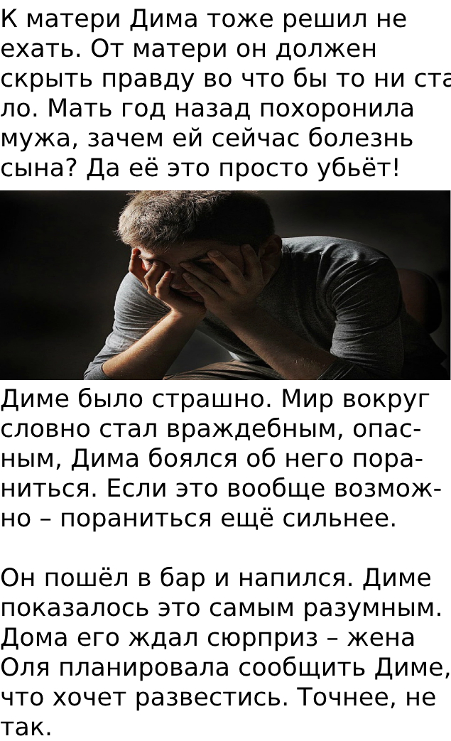 К матери Дима тоже решил не ехать. От матери он должен скрыть правду во что бы то ни стало. Мать год назад похоронила мужа, зачем ей сейчас болезнь сына? Да её это просто убьёт!