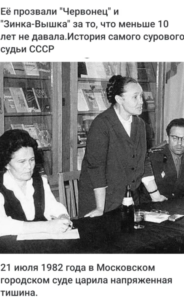 В криминальных кругах её так и прозвали: «Зинка Вышка» и «Зинка Червонец» — за неизменную строгость приговоров, которые редко были мягче 10 лет заключения или высшей меры наказания.
