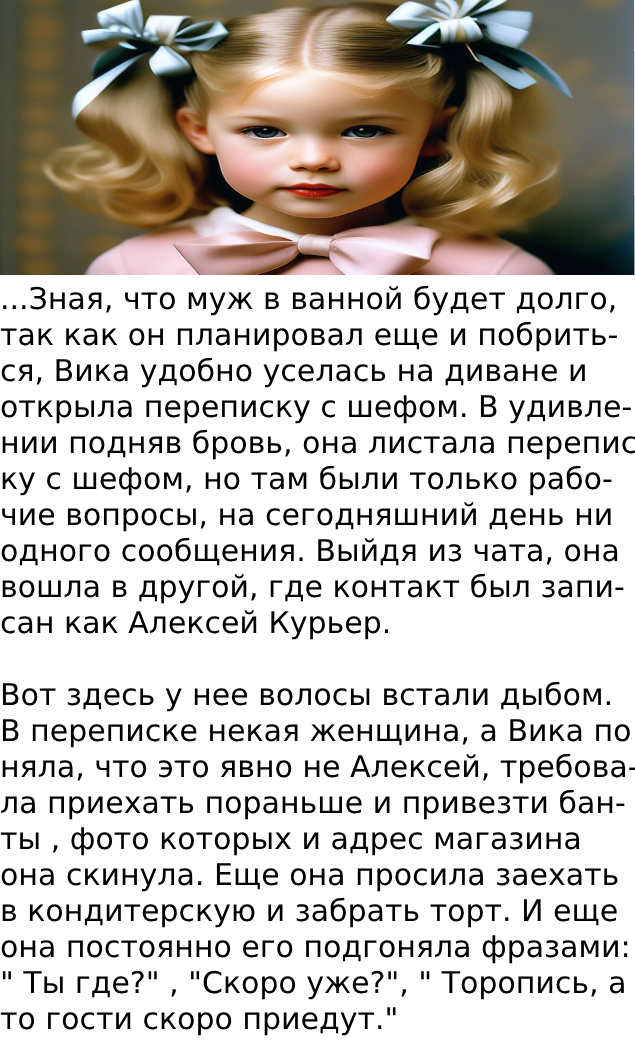 Вот здесь у нее волосы встали дыбом. В переписке некая женщина, а Вика поняла, что это явно не Алексей, требовала приехать пораньше и привезти банты , фото которых и адрес магазина она скинула. Еще она просила заехать в кондитерскую и забрать торт. И еще она постоянно его подгоняла фразами : ” Ты где?” , “Скоро уже?”, ” Торопись, а то гости скоро приедут.”
