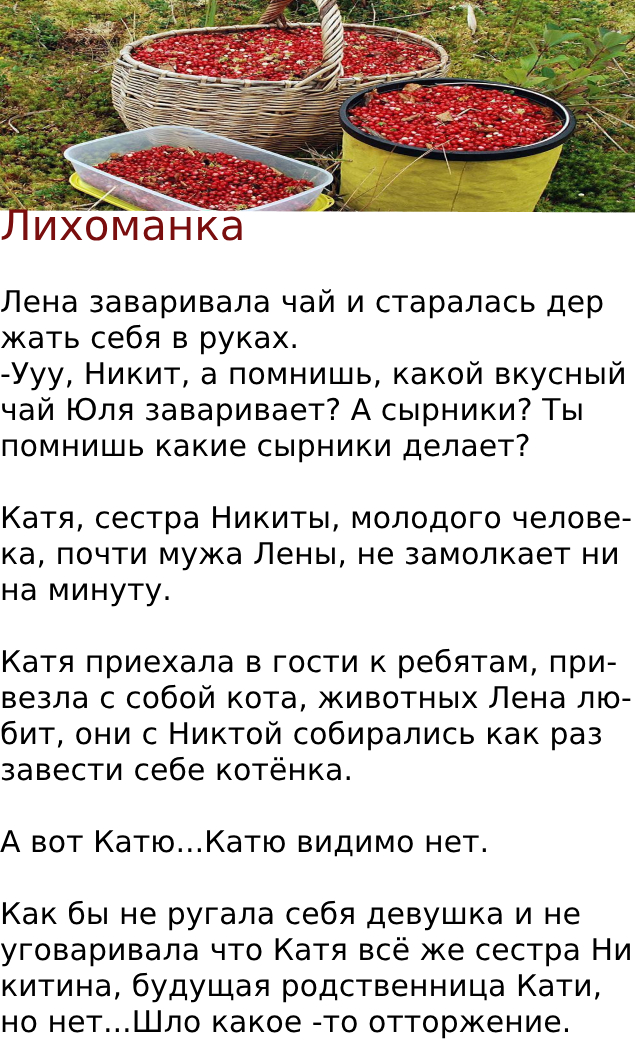 Никита стал другой, Катя всем своим видом показывает что Лена никто, она несётся вперёд Лены подать брату что-то если он попросит, старается оттеснить девушку, выставить её в невыгодном свете, Лена давно это заметила, ещё в прошлые приезды Кати, первый раз решила что сестрёнка просто ревнует братика, но потом пригляделась, нет…Девушка целенаправленно выживает Лену, очерняет, старается вытеснить из жизни своего брата.