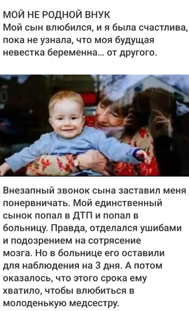 С тех пор прошло 5 лет. Ни разу у меня с невесткой не было конфликтов или разногласий. Никогда она мне грубого слова не сказала и не пренебрегла. Мне казалось, что и с сыном они живут душа в душу. Ну просят взять Игоря на выходные, но они ведь молодые, хотят побыть вдвоем, а я только рада внуку.