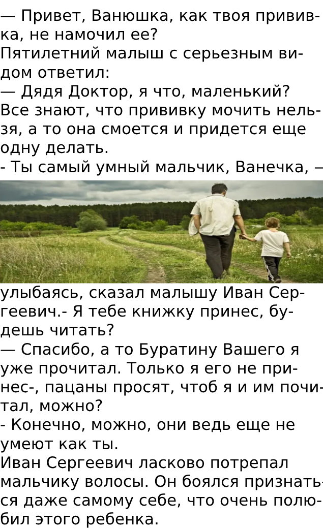 С тех пор как он первый раз увидел Ваню, его тянуло к мальчику со страшной непонятной силой, которой он не мог противиться, да и не хотел. Он чувствовал в нем что-то теплое, родное, поэтому он и забегал в Детский дом по малейшему поводу. Мальчик тоже тянулся к дяде Доктору, при встрече он крепко обнимал его за ноги и стоял, молча, закрыв глаза. У Ивана Сергеевича не было ни жены, ни детей. Невеста, правда, была, Тоня, но он никак не мог решиться сделать ей предложение. Они встречались уже два года и последние несколько месяцев даже жили вместе, но он все сомневался, как-то не так у них складывалось, не было того чувства, что именно она — его половинка. Он чувствовал — Тоня ждет его предложения, но все ж не торопился.
