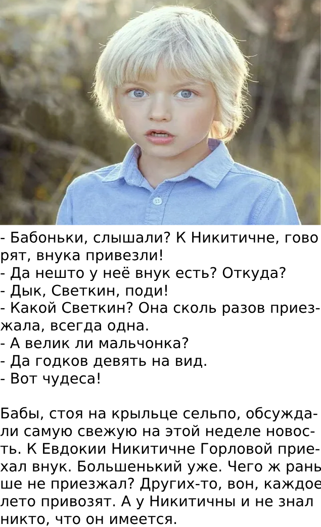 – Бабоньки, слышали? К Никитичне внучок вернулся!