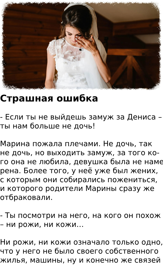 Как вы и догадались, Марине пришлось переступить через свои принципы и согласиться выйти замуж за нелюбимого. Олега отпустили, и он благополучно окончив университет вернулся в родную деревню. Казалось всё позади, от неугодного жениха дочери избавились, подготовка к свадьбе Марины и Дениса в самом разгаре – сшито на заказ свадебное платье, оплачен ресторан и тамада, однако аккурат в день свадьбы Марина поехала в салон красоты и исчезла. Был большой скандал, родители жениха обвиняли родителей невесты, и требовали возместить ущерб, а родители Марины рвали и метали, а когда узнали, что она сбежала к Олегу то пришли в неописуемую ярость. Однако всё это не имело для молодых никакого значения, ведь они любили друг друга и были вместе. Родители Олега организовали молодым скромную, но весёлую свадьбу, и началась для влюблённых новая и счастливая жизнь, однако их счастью не суждено было длиться долго.