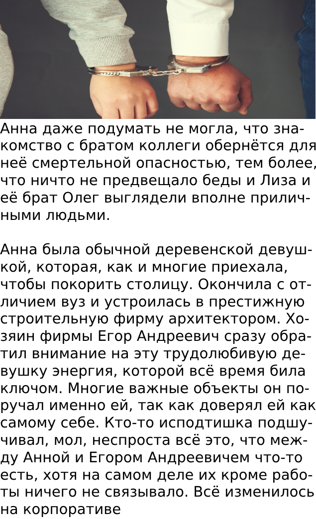 Прошло несколько месяцев, когда Анна поняла, что для неё Олег больше чем просто сотрудник и брат подруги. Вскоре они начали встречаться, а ещё через некоторое время решили узаконить свои отношения. Однако в этот раз не было ни пышной свадьбы, ни белого платья, просто роспись, и просто ужин в ресторане в кругу самых близких и друзей. Анна после свадьбы будто расцвела как роза. В её глазах засверкали задорные искорки, как тогда, когда она была счастлива с Егором Андреевичем. Она уже планировала беременность, думала, кому доверить управлением бизнесом на случай, если ей на некоторое время придётся отойти от дел, как узнала страшное.