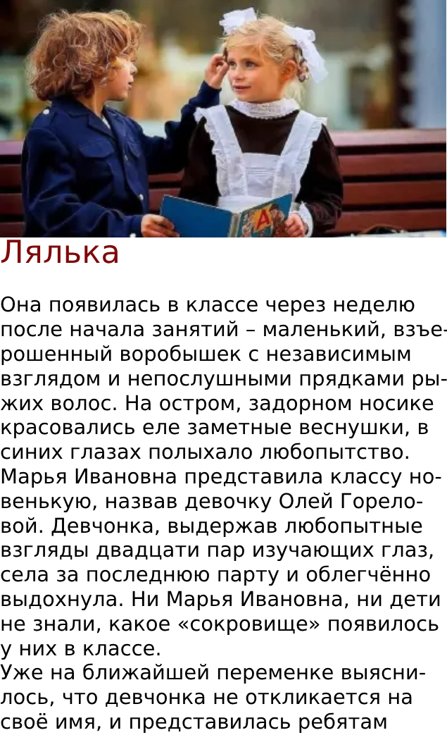 Судьба, видимо, благоволила к девчонке, спасая её из опасных ситуаций, давая попробовать силы в разных областях познания мира. Но даже для всемилостивой судьбы настал предел её терпения. Незадолго до поступления в школу Лялька сильно подвернула ногу, выиграв спор с Мишкой, кто дальше прыгнет с крыши двухэтажного гаража. Проигравшего Мишку с переломом ног увезла «скорая», а девчонке, видимо, пришло время одуматься. Отлежав две недели дома, она опоздала к началу занятий и очень огорчилась. Пообещав родителям, что с «шалостями» покончено навсегда, Лялька чинно пришла в школу с твёрдым желанием учиться, но Лёшка…