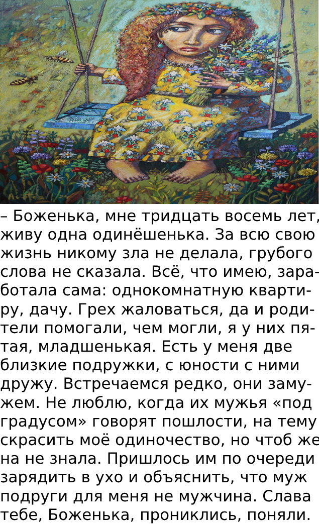 Замолчав на мгновение, Надежда с тоской в глазах повернулась к окну и подумала о том, как много там за стеклом счастливых людей и таких же несчастных, как она. Снова повернувшись к божьему лику, продолжила: