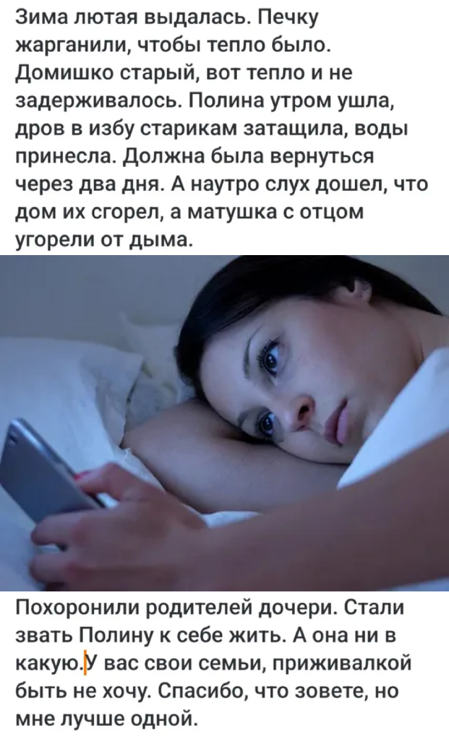 Зима лютая выдалась. Печку жарганили, чтобы тепло было. Домишко старый, вот тепло и не задерживалось. Полина утром ушла, дров в избу старикам затащила, воды принесла. Должна была вернуться через два дня. А наутро слух дошел, что дом их сгорел, а матушка с отцом угорели от дыма.