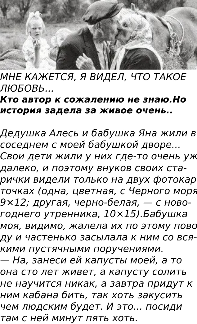 А в то лето, помню, бабушка Яна заболела. Мы пришли проведать ее, а дед Алесь, грубиян и матерщинник, стоял на коленях у кровати и целовал ее старые морщинистые руки.