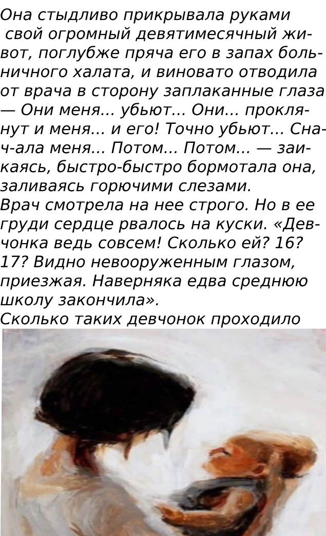 Прошло 4 месяца. Девочка вновь появилась на пороге роддома. С ребёнком на руках. Врач увидела мельком её испуганный взгляд в просвете на секунду открывшейся двери приёмного покоя, и сердце её, почуяв неладное, опять больно сжалось в груди.