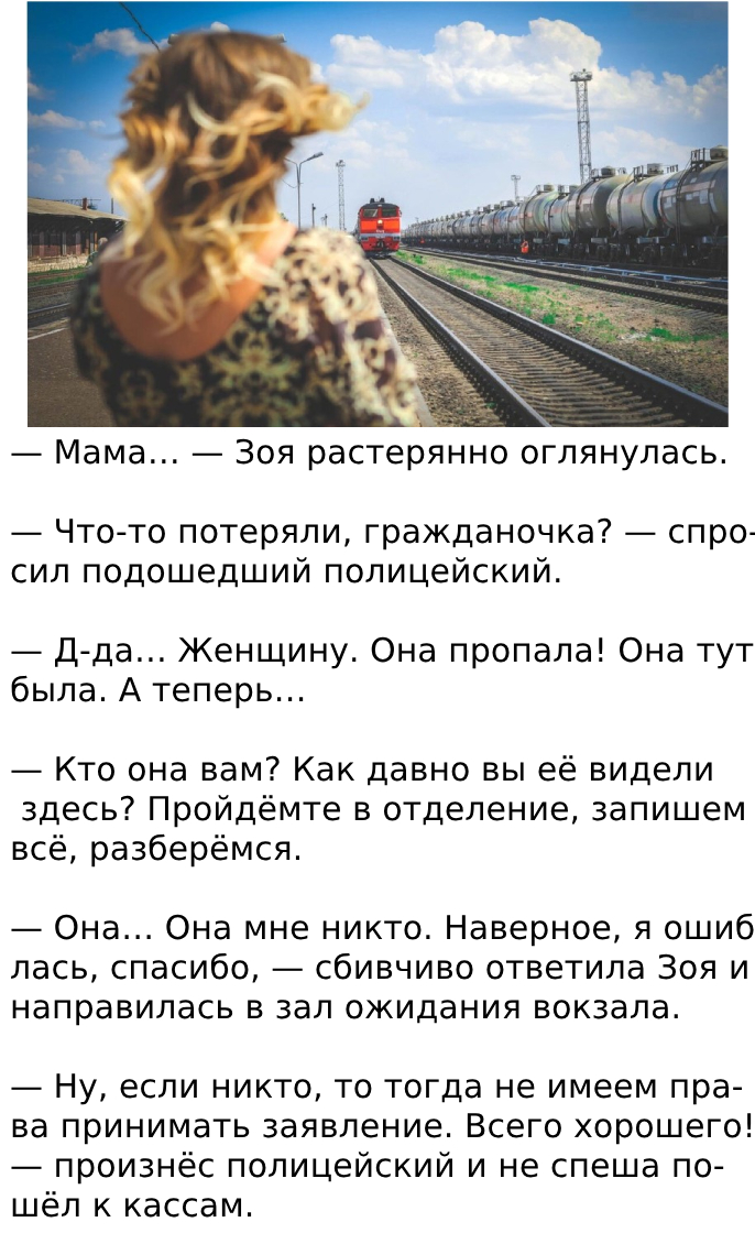 Выросла Зоя и уехала из детского дома, поступив в колледж. Это Лилия Борисовна подсказала. Она выяснила, что если Зоя туда поступит на очное обучение, то она будет иметь право на полное государственное обеспечение и дополнительные гарантии по социальной поддержке до окончания учёбы. Что ей обязательно дадут общежитие и даже заключат договор о проживании, ведь Зое как раз исполнялось в мае 18 лет. Девушка поступила, выучилась и получила суровую мужскую профессию — осмотрщик железнодорожных вагонов. Потом квартиру ей дали от государства однокомнатную, крошечную в старом-старом доме, на вид, прямо-таки, дореволюционной постройки. А она и этому была рада. Зато своё жильё, отдельное! Потом Зоя нашла работу: в паре автобусных остановок от дома находился железнодорожный вокзал.
