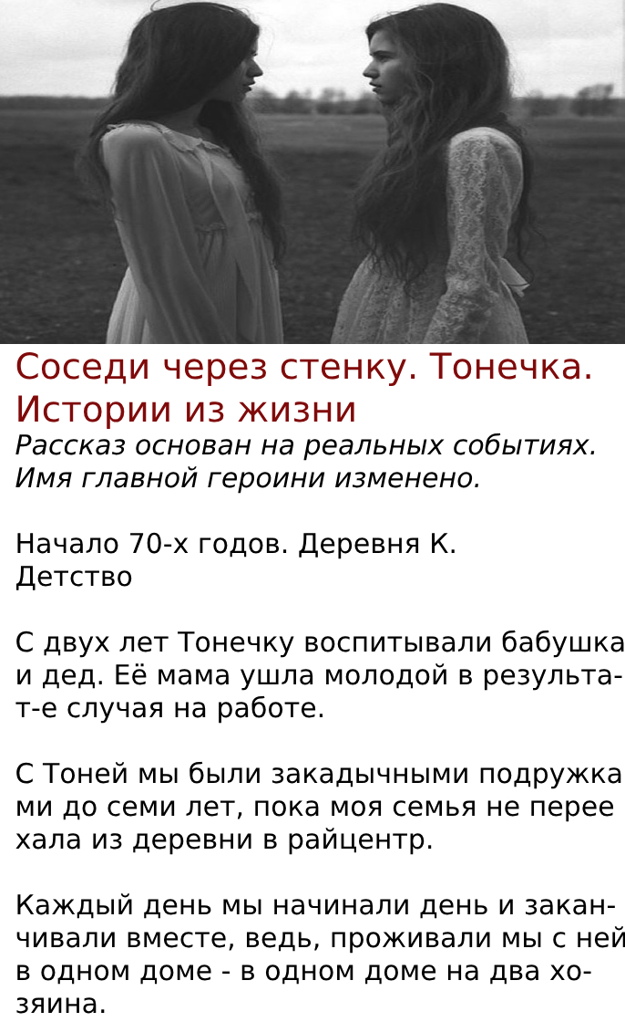 Тоню моя мама жалела, была с ней всегда ласковой и мне наказывала на неё не обижаться — мол, её и так обидела судьба — тяжело без мамы расти — моя мама знала по себе.