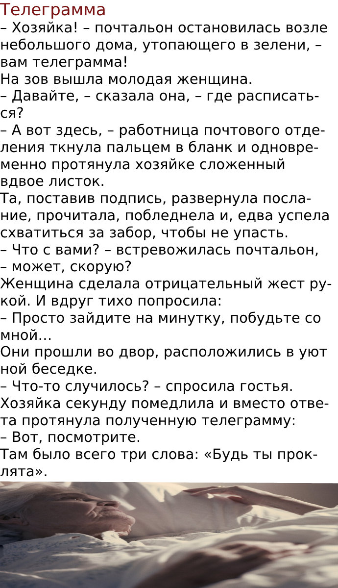 Ну, а теперь это, – Ирина взяла в руки телеграмму, – проклинают. Не знаю, кто. Может, она. А, может, братец. Подписи нет. Радости мало, конечно. Я даже испугалась в первое мгновение. А теперь думаю: ну и что? Это же не материнское проклятие. Чего бояться? Как думаете?